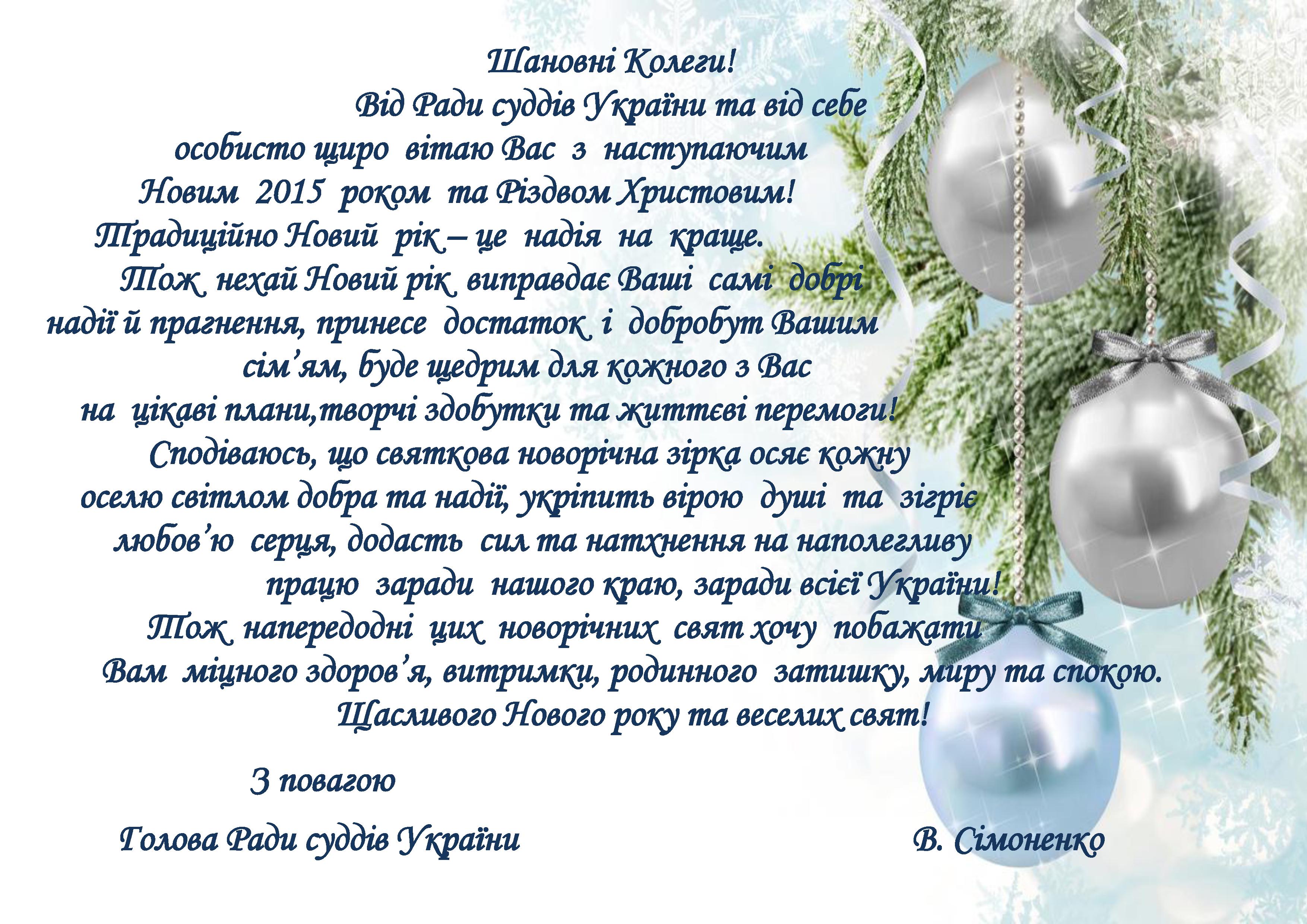 Привітання голови Ради суддів України з Новим роком та Різдвом Христовим