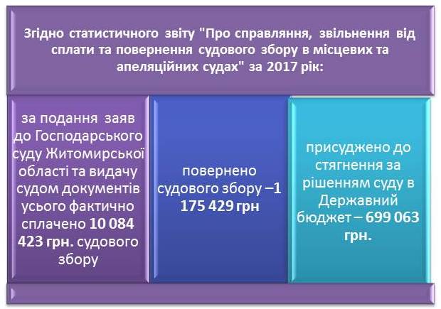 Згідно з даними звіту 1-МС про результати розгляду судових справ за 2017 рік до Господарського суду Житомирської області надійшла 3521 заява (враховуючи заяви в межах розгляду справ про банкрутство, скарги на дії органів Державної виконавчої служби України, заяви про відстрочку (розстрочку) виконання судового рішення та заяви (скарги, клопотання) у справах позовного провадження), що на 115 заяв менше в порівнянні з 2016.