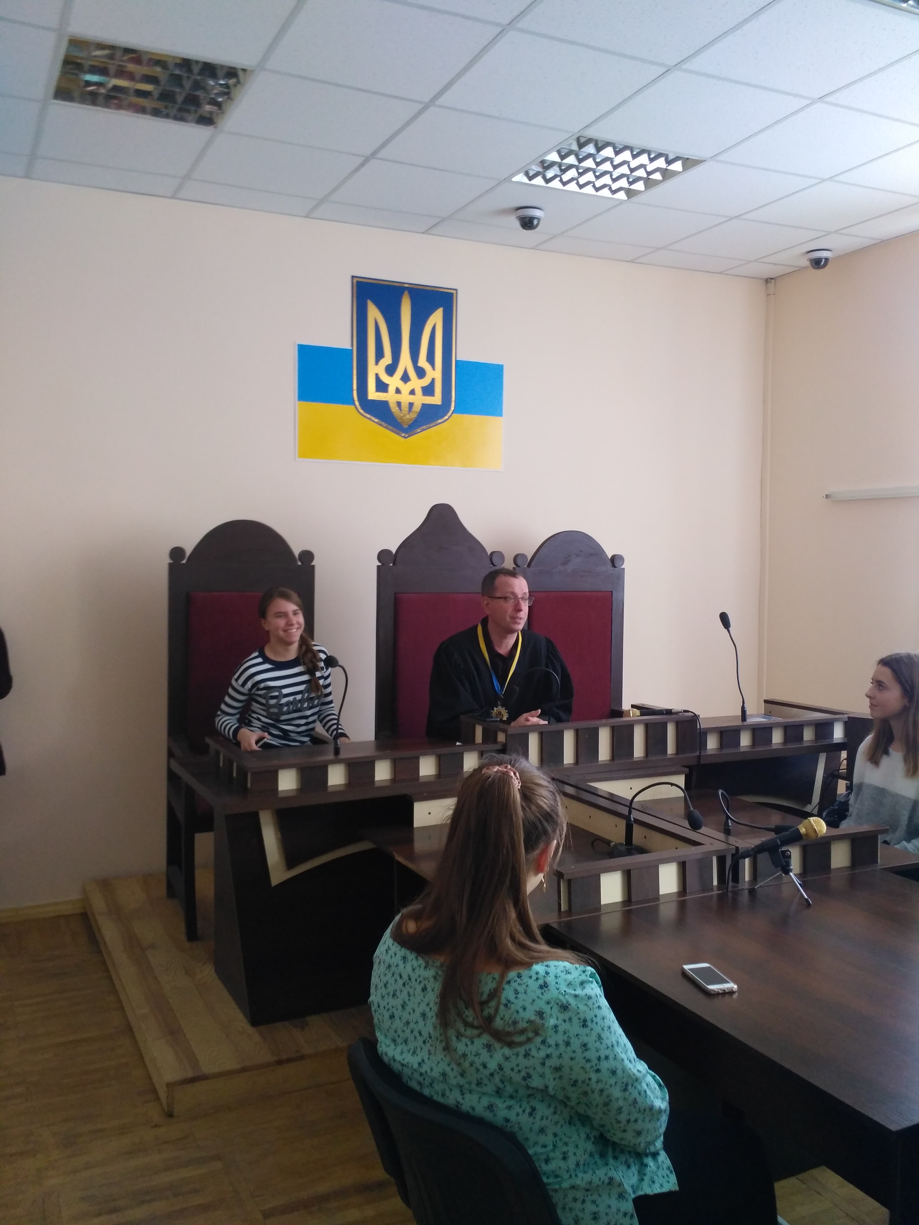 Після екскурсії по суду школярі повернулись до зали судового засідання, де з учасниками заходу провів бесіду голова суду Шелюховський М.В., який одразу ж запросив до себе у крісло судді старосту класу. Він розповів про роботу судді, категорії справ, які розглядаються в місцевих судах, про загородження, яке відокремлює обвинувачених (підсудних), засуджених від складу суду та присутніх, що відповідає європейським стандартам, про розгляд справ у режимі відеоконференцзвязку за участі присяжних та ін. Дав відповіді на запитання дітей та вчителя.