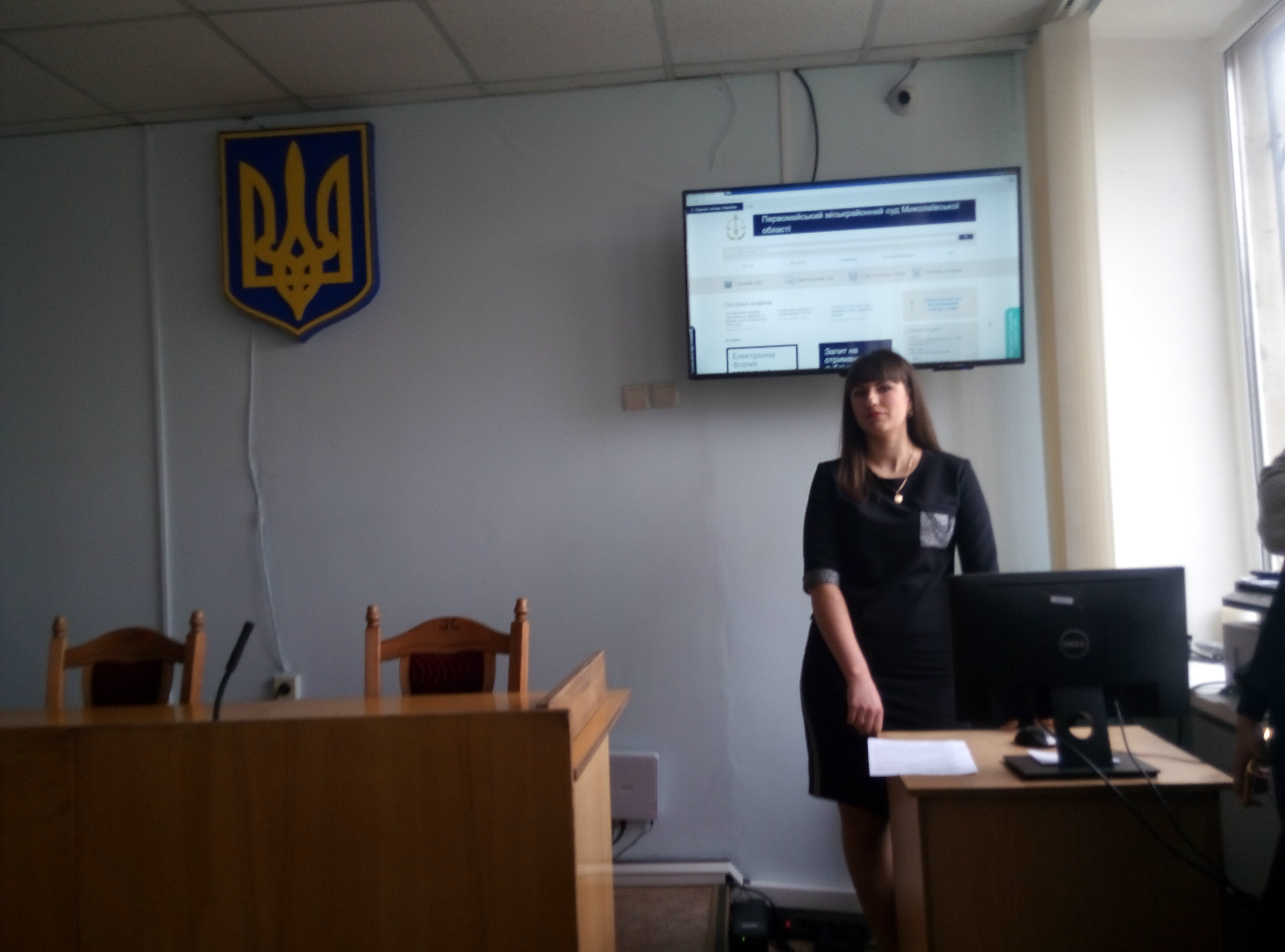 Коли всі студенти розмістилися у залі, Тетяна Яківна розповіла про те, як розподіляються справи між суддями, у якому вигляді надходять до суду та які умови висуваються до сучасного обладнання залу засідань. З порядком роботи у комп’ютерній програмі Д-3, порядком реєстрації справ різних категорій, ознайомив провідний спеціаліст з інформаційних технологій Беженуца О.І. Також, було оглянуто веб-сайт суду, продемонстровано судове засідання у режимі відеоконференцзв’язку. Секретар судового засідання Лянгорт З.О. розповіла студентам про засоби фіксування судового процесу.
